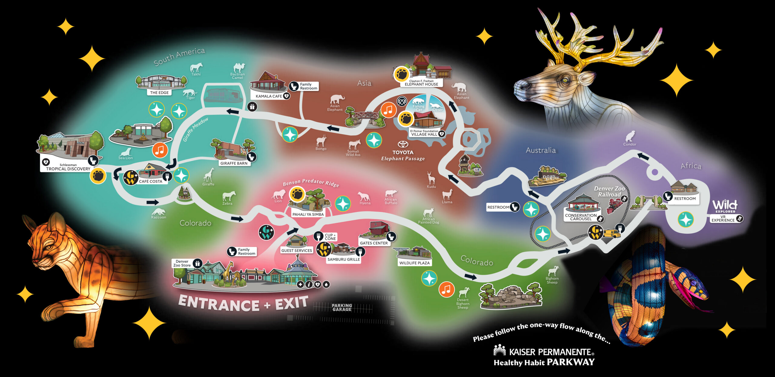 ¡Atrévete a caminar entre un caimán gigante, conversa con los cantores periquitos y maravíllate con las impresionantes exhibiciones botánicas! Descarga nuestro mapa de eventos para ver las ubicaciones de las linternas interactivas, la observación de animales, el entretenimiento musical y los lugares para comer.