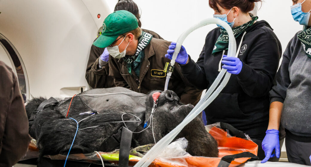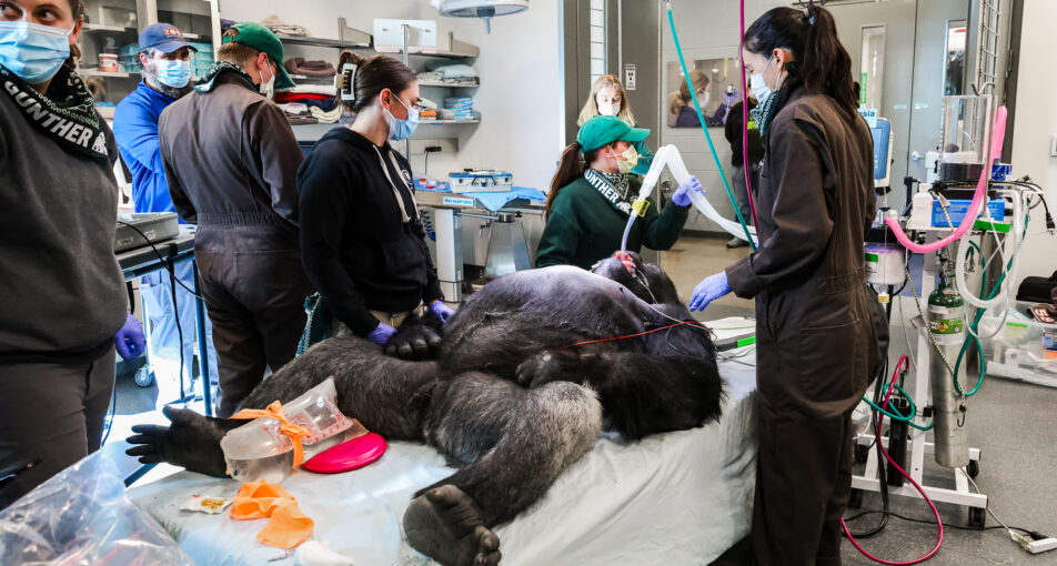 To keep care organized and efficient, two dedicated teams of Animal Care Specialists, Clinical Veterinarians, and Registered Veterinary Technicians (RVTs) were assembled—one for each gorilla. Team members identified themselves by wearing colorful bandanas: red for Kal and green for Gunther.